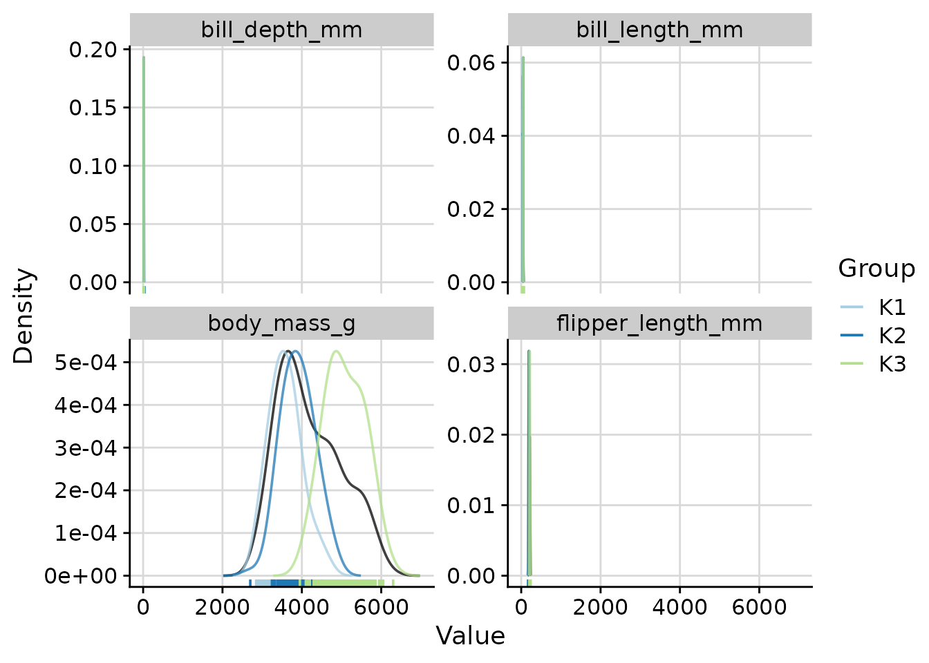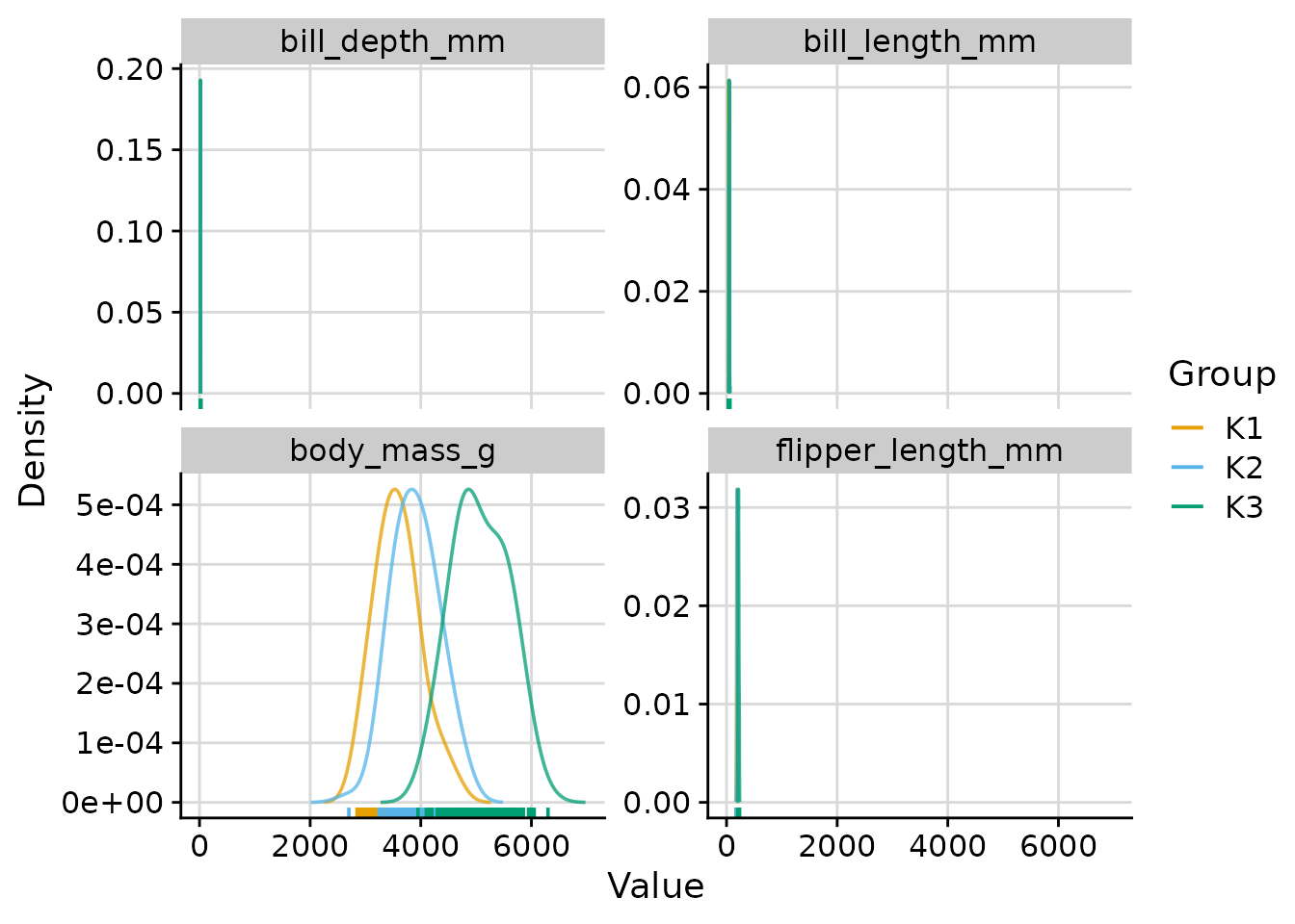 "cluster": one density curve per cluster.