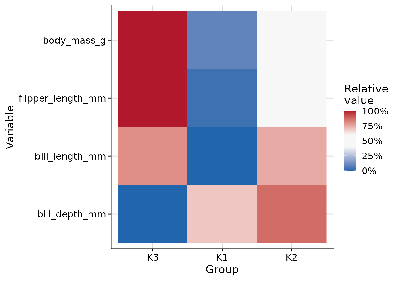 plot_cluster_heatmap(penguins, cluster = "cluster", vars = vars_penguin)