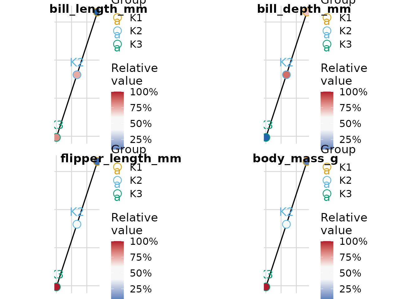 penguins$cluster <- paste0("K", km$cluster)Heat Maps with plot_cluster_heatmap