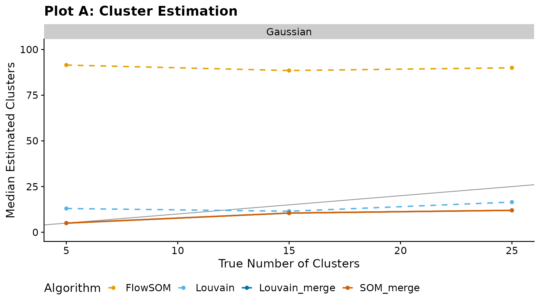 Median number of estimated clusters versus the true number of clusters. The diagonal line indicates perfect recovery.