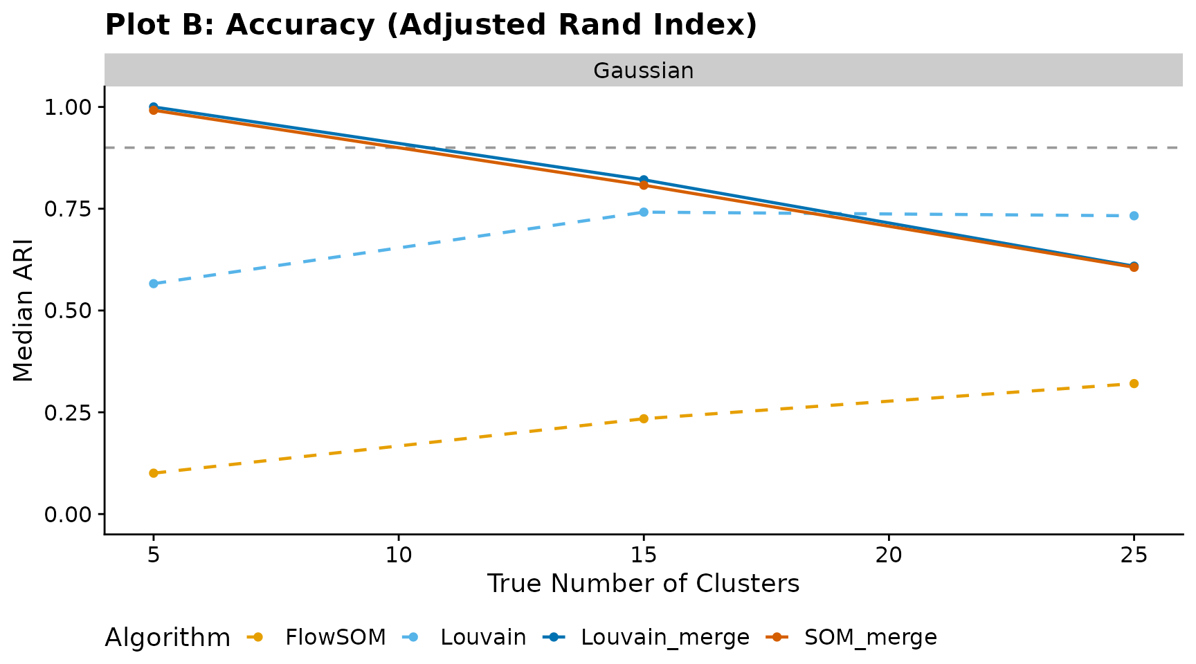 Median ARI versus true cluster count. The horizontal dashed line at 0.90 marks the high-accuracy threshold.